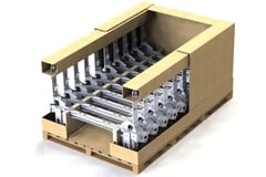 The Fibre-Based Automotive Chassis Packaging Solution features corrugated cardboard positioners, which are included at the base of the container and on the upper sides of the packaging structure to keep the heavy-duty automotive chassis parts fixed and secure.