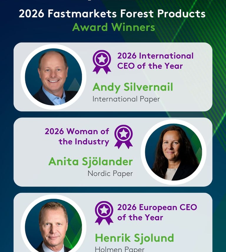 Henrik Sjölund, CEO of Holmen Paper, was named European CEO of the Year. Despite weak European demand, Sjölund strengthened Holmen's position through disciplined execution and operational flexibility, particularly in handling volatile electricity prices. Holmen also advanced preparations for new regulations like the EU Deforestation Regulation.