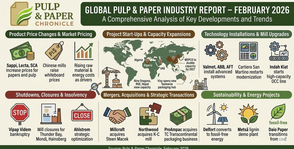 The global pulp and paper industry continues to undergo significant transformation as companies respond to fluctuating demand, rising production costs, sustainability pressures, and technological advancements. February 2026 developments highlight major investments in production capacity, mill upgrades, product innovations, pricing adjustments, and financial performance updates across global markets.