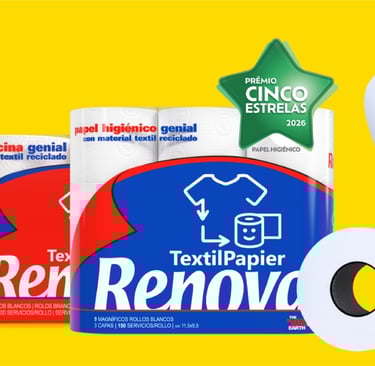 Launched in 2025, Renova TextilPapier is the result of a patented technology that allows the reuse of end-of-life textiles, such as t-shirts and jeans, transformed into toilet paper and kitchen rolls. The solution contributes to the reduction of waste destined for landfills or incineration, integrating industrial innovation with circular economy practices.