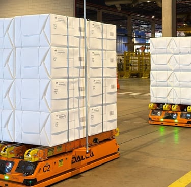 Developed specifically to meet the company's needs, the FlexNav has the capacity to transport up to four tons and is designed to accommodate two sets of pulp bales per operation. The robots operate fully autonomously and are connected in real time to a central system that monitors and coordinates activities, including managing battery charging.