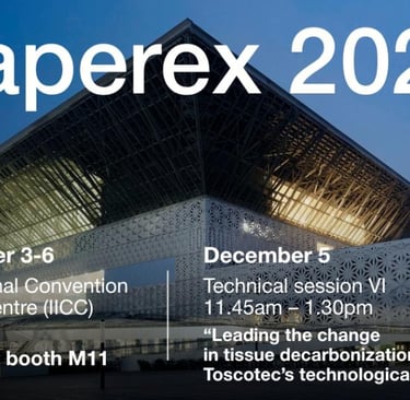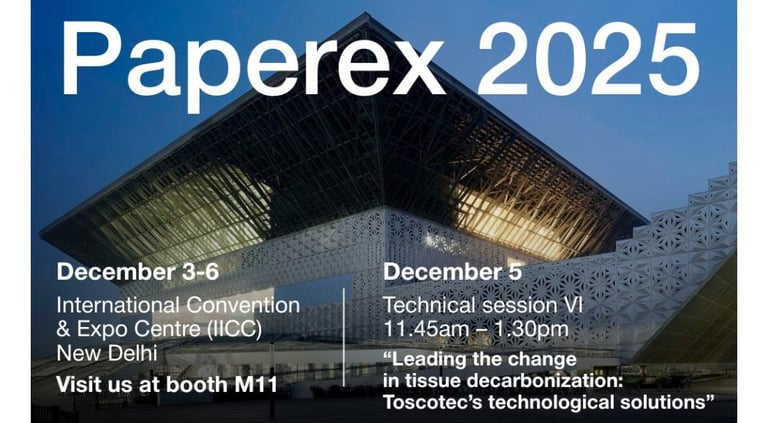 Paperex, now in its 17th edition, is held biennially in India and serves as a vital business hub for the global paper sector. Toscotec invites attendees to visit booth M11 and attend the presentation to discover the cutting-edge technologies shaping the future of sustainable tissue manufacturing.