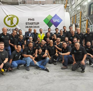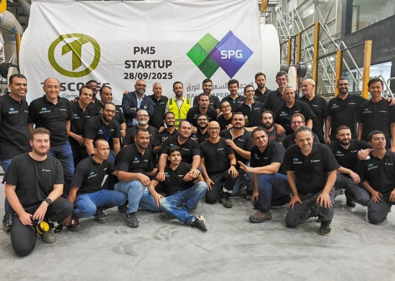 Toscotec has started up the new PM5 AHEAD 2.2L tissue line for Saudi Paper Group (SPG) at its Dammam mill, further expanding SPG’s production capacity in Saudi Arabia. Supplied on a turnkey basis, PM5 is a double‑width AHEAD 2.2L machine with a trim width of around 5.6 m, design speed of 2,200 m/min and an annual capacity above 60,000 tonnes of tissue for toilet, towel and facial products. The line is equipped with TT NextPress shoe press, a third‑generation TT SYD steel Yankee dryer and a high‑efficiency TT Hood, integrated into a gas‑turbine‑based energy concept to maximise energy efficiency and reduce operating costs. Together with Toscotec’s stock preparation, approach flow and OPTIMA rewinders, PM5 lifts SPG’s overall tissue capacity by about 65,000 tonnes, backing its GCC and MENA market growth strategy.