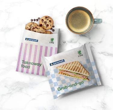 The co-creation concept pairs UPM Solide™ Lucent or UPM Prego™ papers, specifically engineered as a base for barrier coatings, with Paramelt Aquavate™ Bio SB 2383, a water-based coating formulated exclusively from biodegradable components. Together, these materials create a functional packaging solution suitable for a wide range of food products, including bakery, grab-and-go, and other dry or greasy goods.