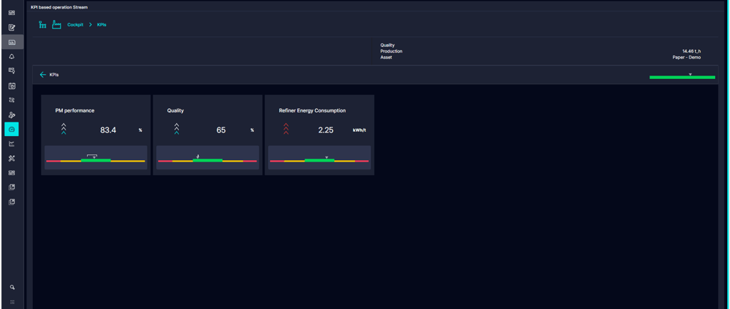 To gain more detailed insights into individual machine components and processes, staff can access the Production Cockpit. “Here, too, it was important to us to first provide a compact overview of the most important values, which the operator can define themselves,” explains Zsuzsanna Ozvary, Project Manager UX/UI Co-Development at Voith Paper. “A traffic light color system makes it immediately clear whether or not the respective key figures are within the desired range.” The limits can be set as classical static limits or be adaptive based on grades or more advanced algorithms (or rule/calculation-based). If necessary, users can dive deeper into the data.